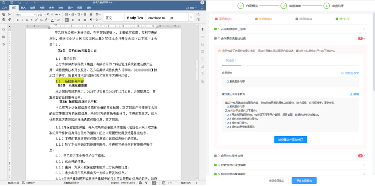 评语:深度融合大语言模型与SmartBrain,实现合同语义理解与规则智能生成,集成onlyoffice提供无缝文档编辑体验。实现合同审查智能化与标准化,大幅提升审查效率与准确性,为科研管理减负提效。已完成全功能开发与流程验证,目前该AI应用已在新疆某农垦院项目中全面投入使用,验证了其在真实场景中的可靠性与实用性为SRP智慧科研平台提供智能化起点,具备较强的业务适配与推广潜力。